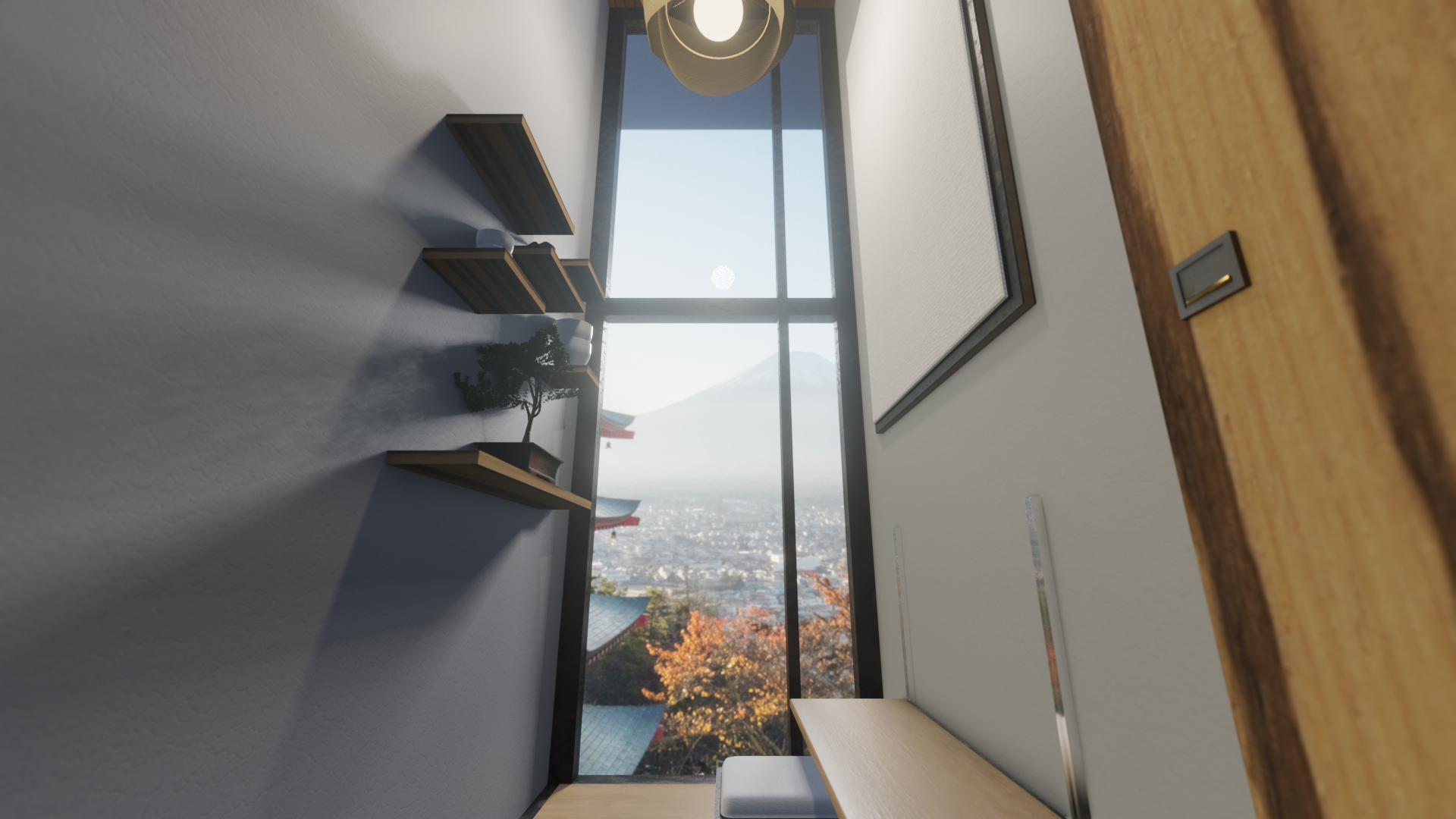 The living space is almost double height. There’s a large set of windows in this mockup, though the source had a balcony. On the main wall, there’s a large canvas frame to absorb sound as well as place-hold for artwork and a custom height adjustable desk with custom seats. On the back wall, a shelf is mounted for decor, objects, as well as a bonsai tree. I once bought one for my mom but it died in eight days, before I could give it to her. Poor Ricardo. It lasted 44 years before it met me. I realize now that they need light, so this one is by the window.