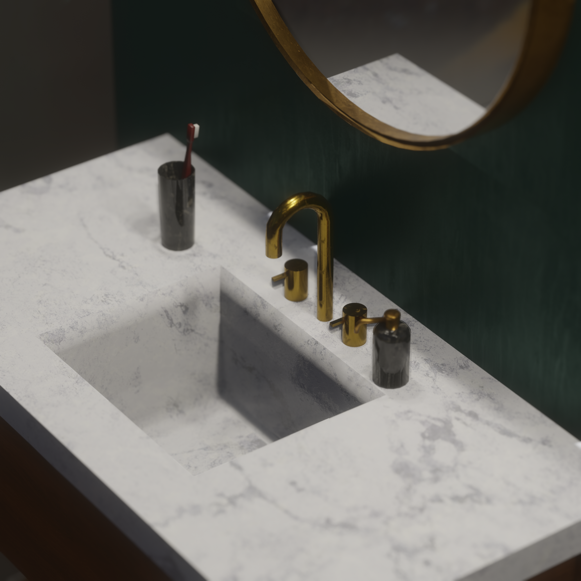 The bathroom features more satin finished walls with modern looking fixtures in brass and weathered gold plating. To prevent accidental flooding, there’s a slight angle on the floor where the tub is that leads to a drain in the far corner, beside the tub faucets. There’s a towel rack on the back front wall, a vanity with open space and drawer space, as well as a medicine cabinet behind the brass mirror.