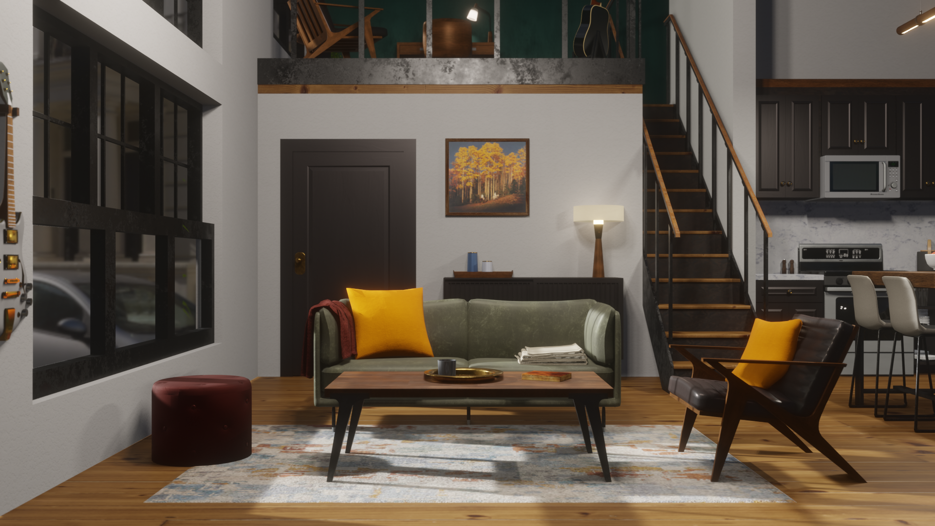 Overall, I had a lot of fun on this project. I didn’t show the laundry area or the closet because they’re basic and not interesting. I found the perceived size of the loft to be deceiving; the height allows for vertical expansion, but it doesn’t really affect the living room square footage. So, it was definitely a challenge to balance out the dimensions. So, despite the dark accents throughout the unit, I maintained a use of thinner furniture legs and staircase rails to balance out the visual heft of the espresso dominated scheme.